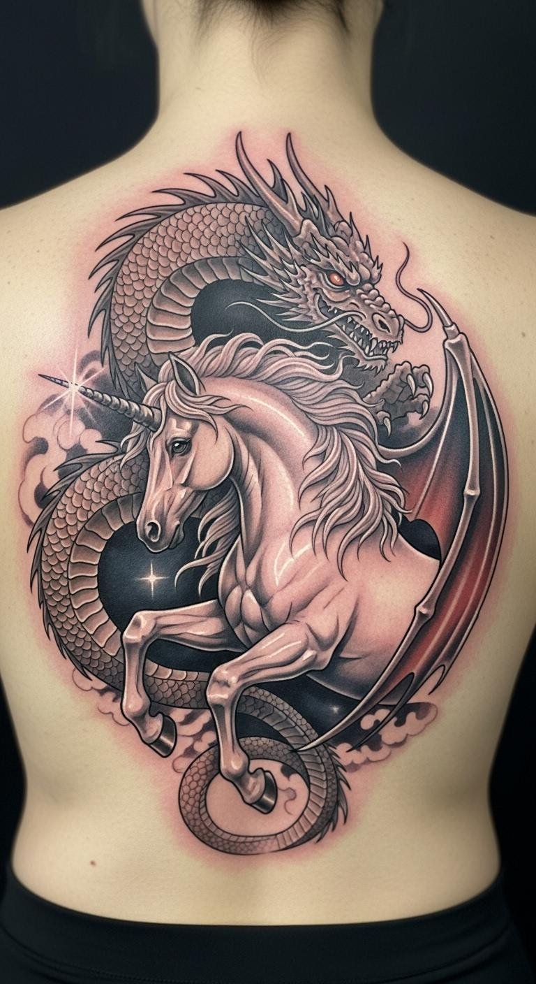 This tattoo design symbolizes the balance of purity and strength, merging the ethereal beauty of the unicorn with the fierce wisdom of the dragon.