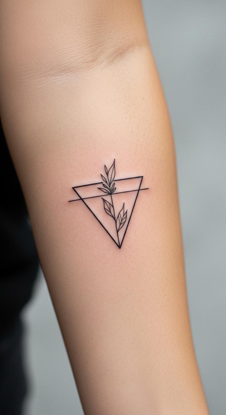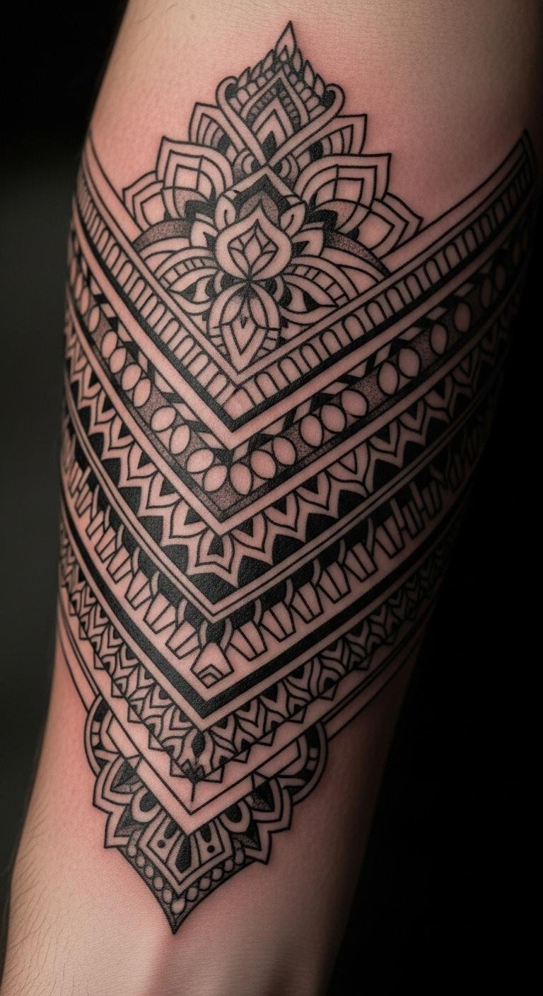 The geometric patterns on the forearm symbolize strength and symmetry, representing the balance between modern minimalism and artistic expression.
