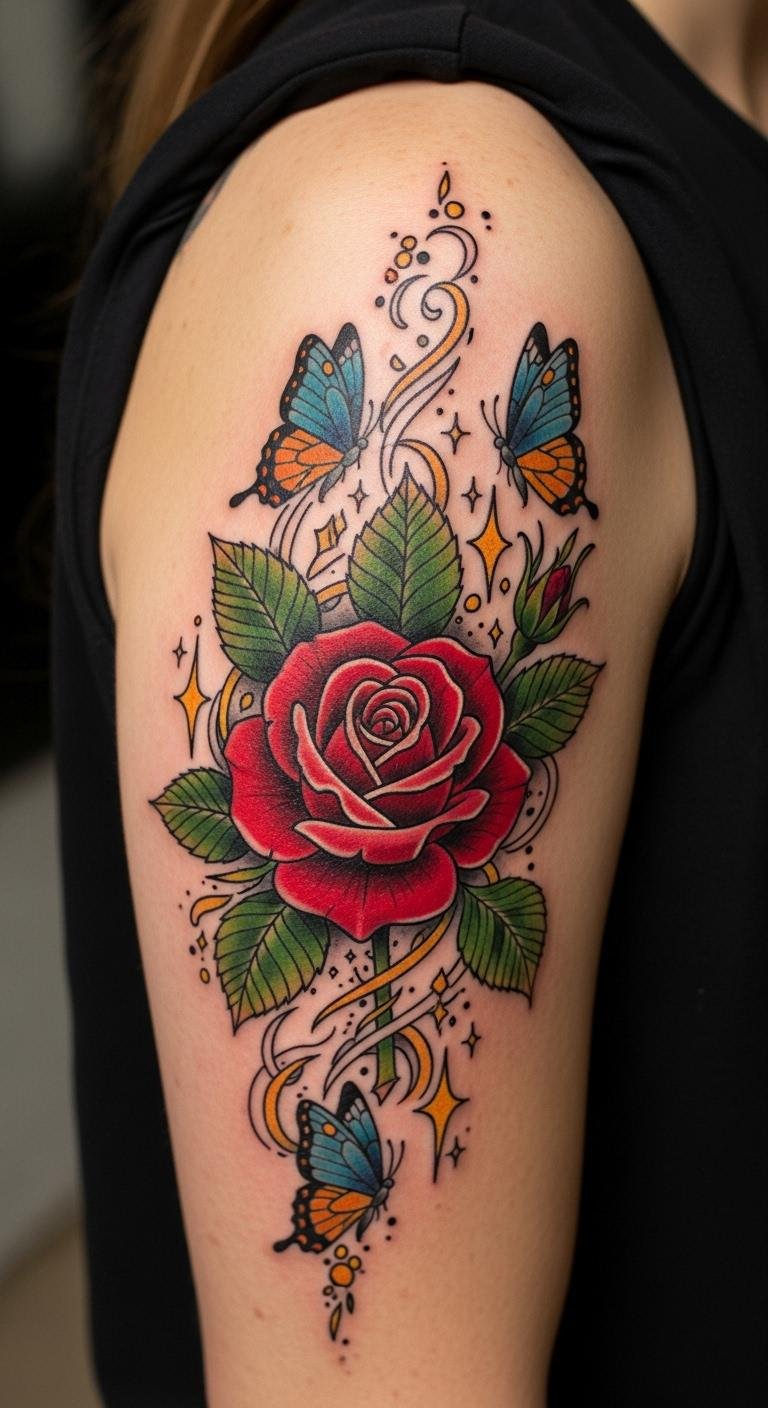 This upper arm tattoo symbolizes beauty and transformation, with the rose representing love and passion while the butterflies embody freedom and change.