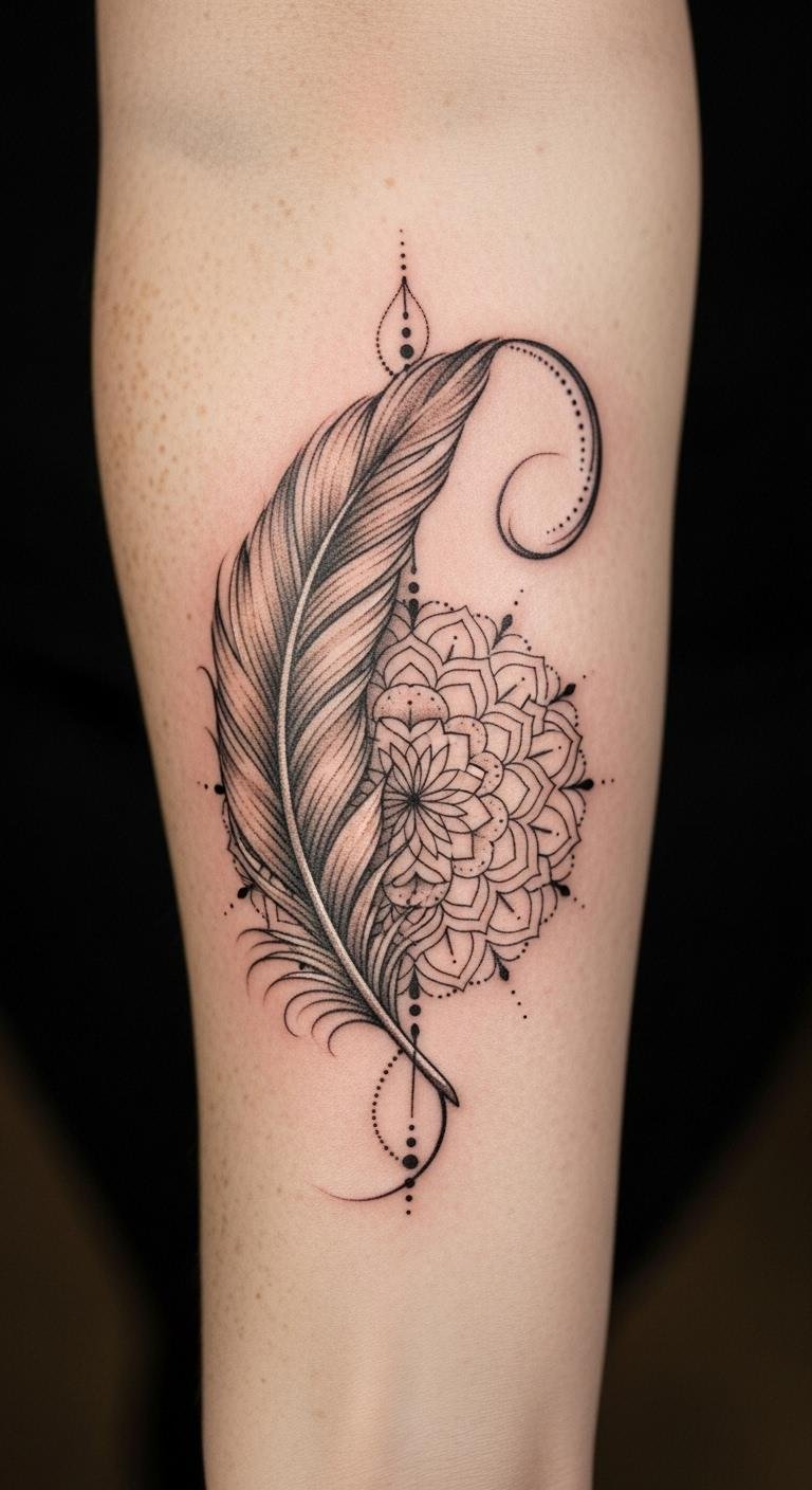 The delicate feather embodies hope and the pursuit of dreams, while the intricate mandala signifies the evolution of self, resilience, and inner peace.