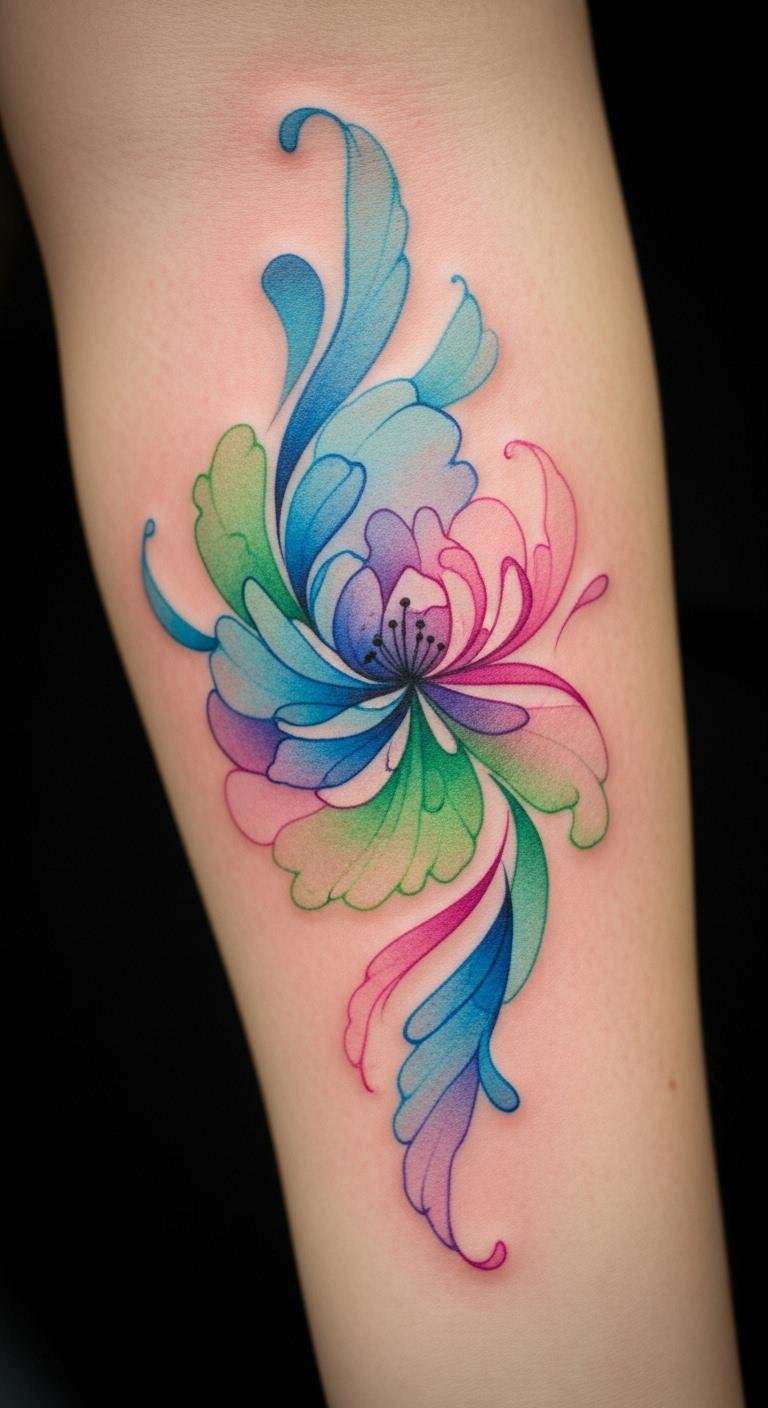 The flowing colors and gentle brushstrokes evoke feelings of joy and creativity, making the tattoo not just an adornment, but a living masterpiece that resonates with the spirit.
