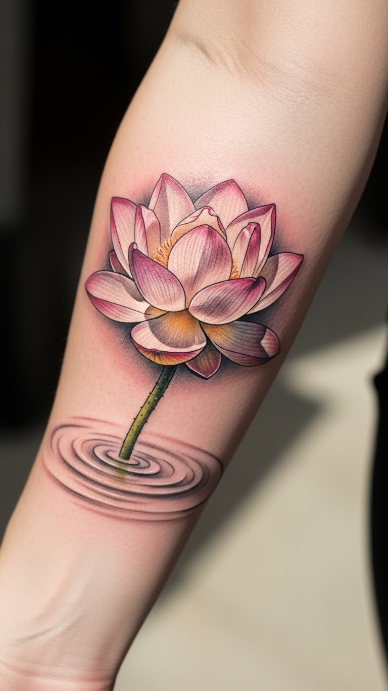 This tattoo symbolizes resilience and transformation, as the lotus flower rises beautifully from muddy waters, embodying purity and enlightenment.