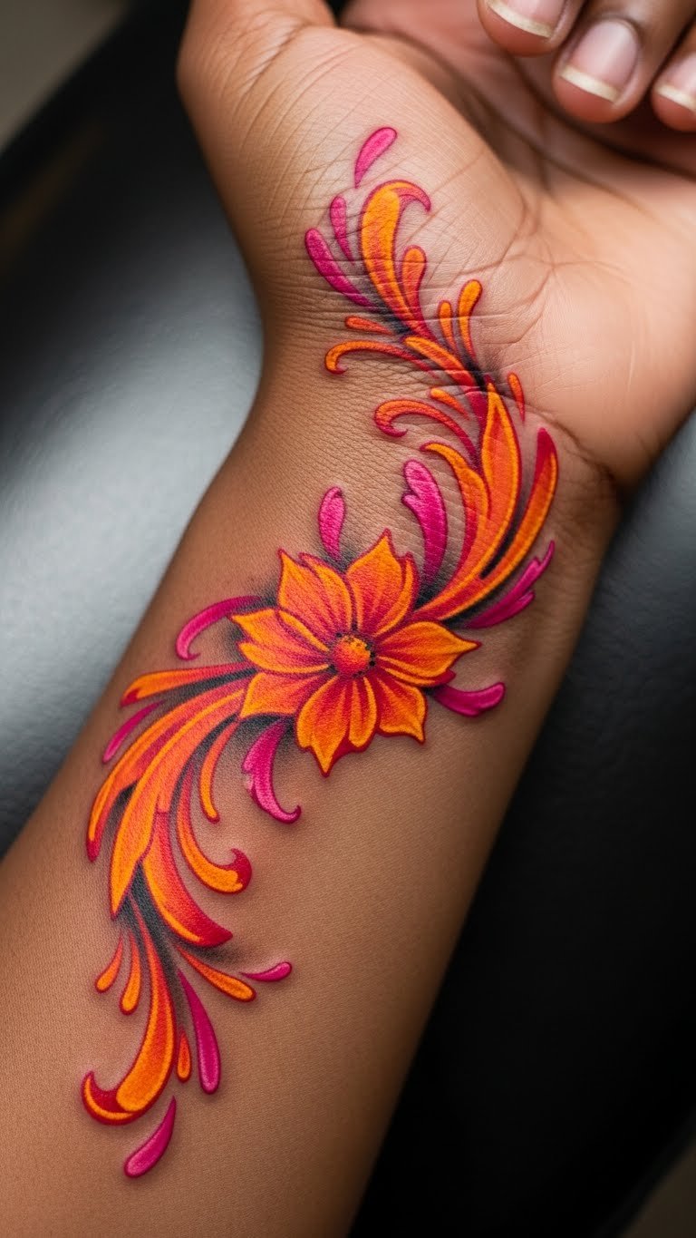 Placed on the forearm, this design allows for visibility and personal expression, making it a constant reminder of one’s journey and the vibrant energy one brings into the world.