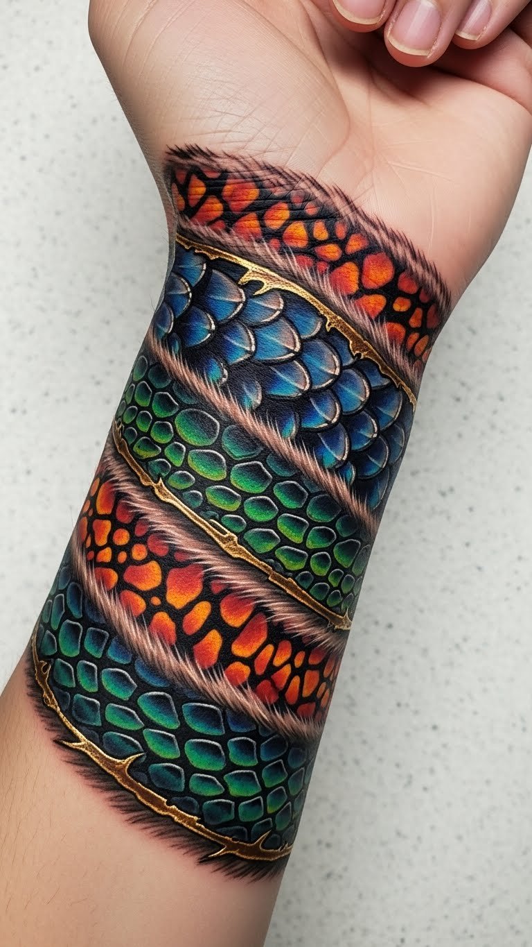 The fur symbolizes warmth, protection, and resilience, while the scales reflect adaptability and strength.