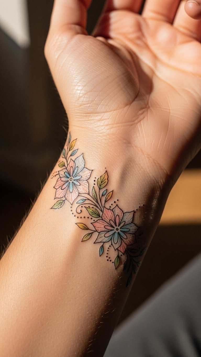 Positioned on the wrist, it serves as a constant reminder of resilience and the blooming of new beginnings. The gentle colors evoke a sense of calm and femininity, making it an ideal choice for someone seeking a meaningful yet aesthetically pleasing cover-up.