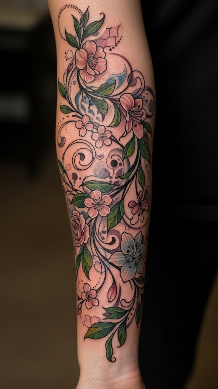 The tattoo on the forearm symbolizes growth and transformation, with the floral elements representing new beginnings and the geometric shapes signifying stability and balance.
