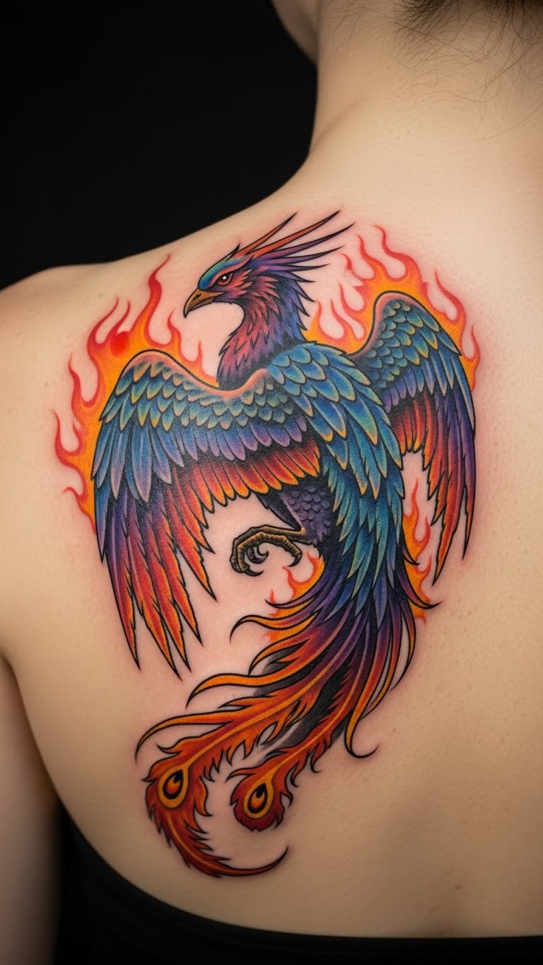 This phoenix tattoo symbolizes rebirth and transformation, reflecting the journey of overcoming challenges and emerging stronger.