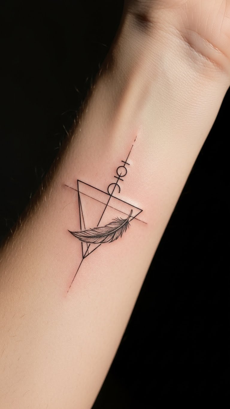 The feather tattoo symbolizes freedom and transformation, embodying the wearer’s desire for a fresh start in life.