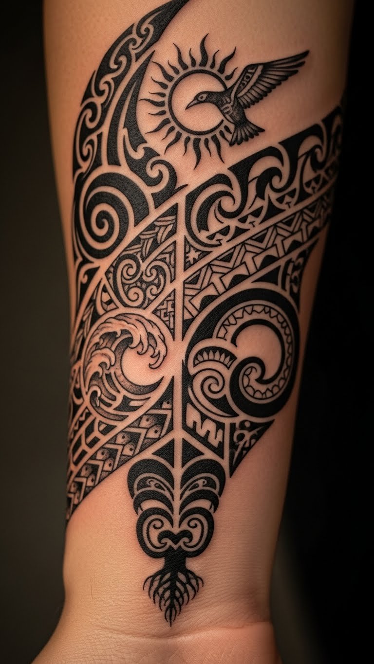 This tattoo symbolizes a deep connection to one’s roots, with every curve and line representing a story passed down through generations.