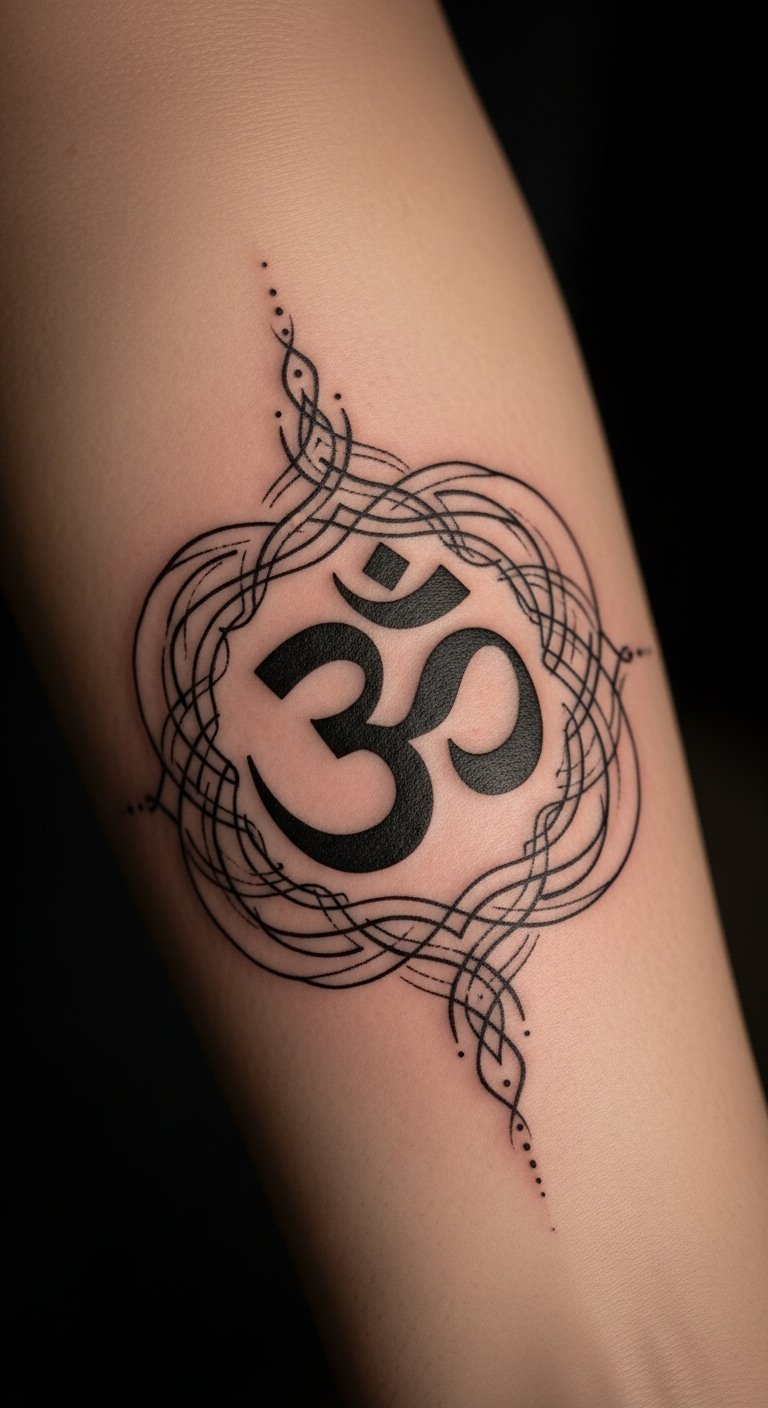 The Om (ॐ) tattoo symbolizes the essence of the universe, embodying spiritual vibrations that foster inner peace.