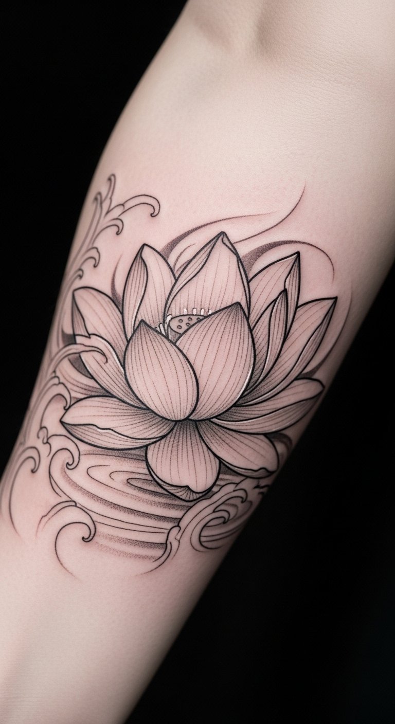 Placed on the forearm, it serves as a constant reminder of inner peace and self-discovery, inviting reflection and growth. The unfolding petals represent personal evolution, transforming past struggles into profound insights, making it a meaningful addition to one’s personal narrative.