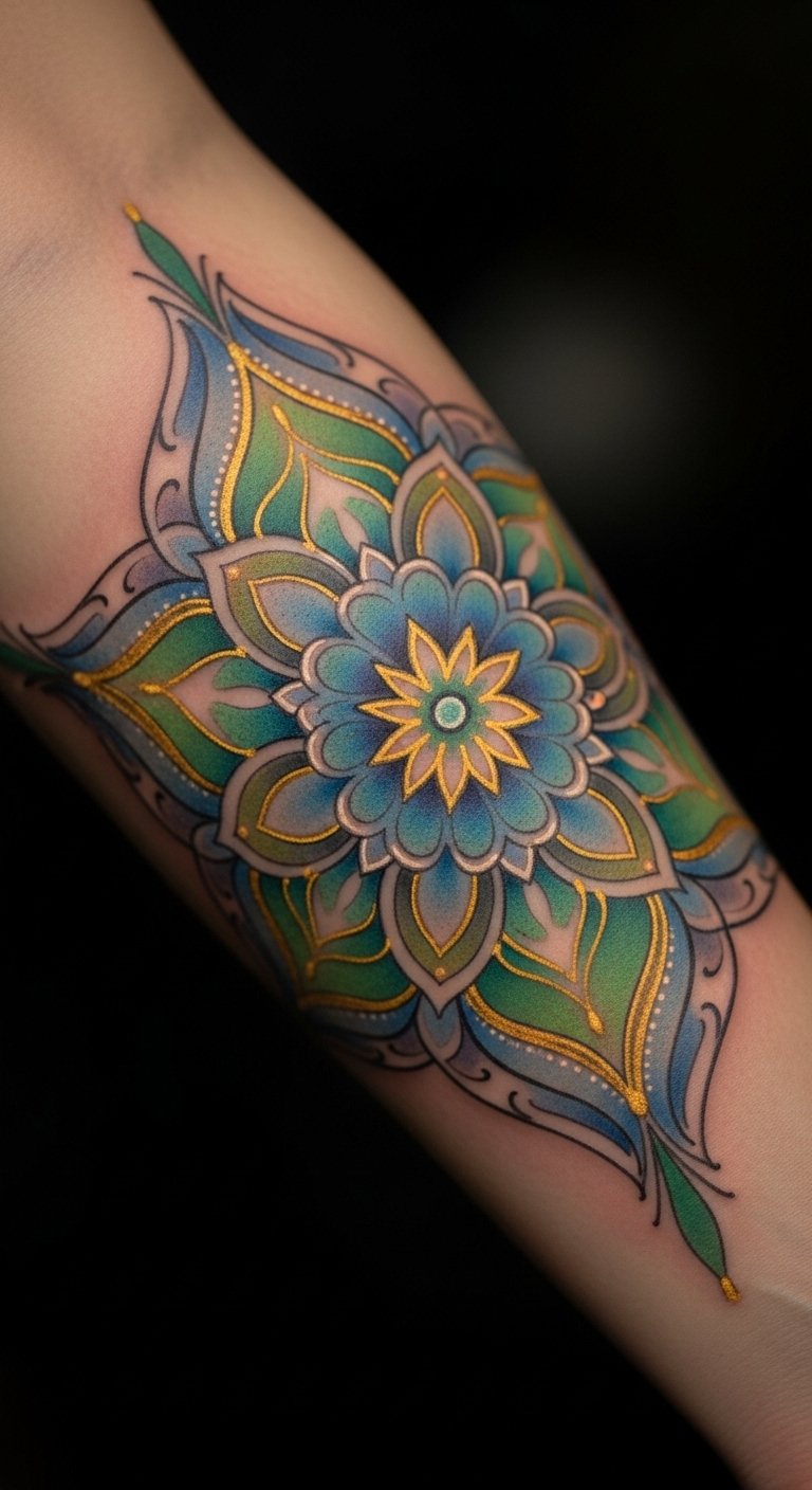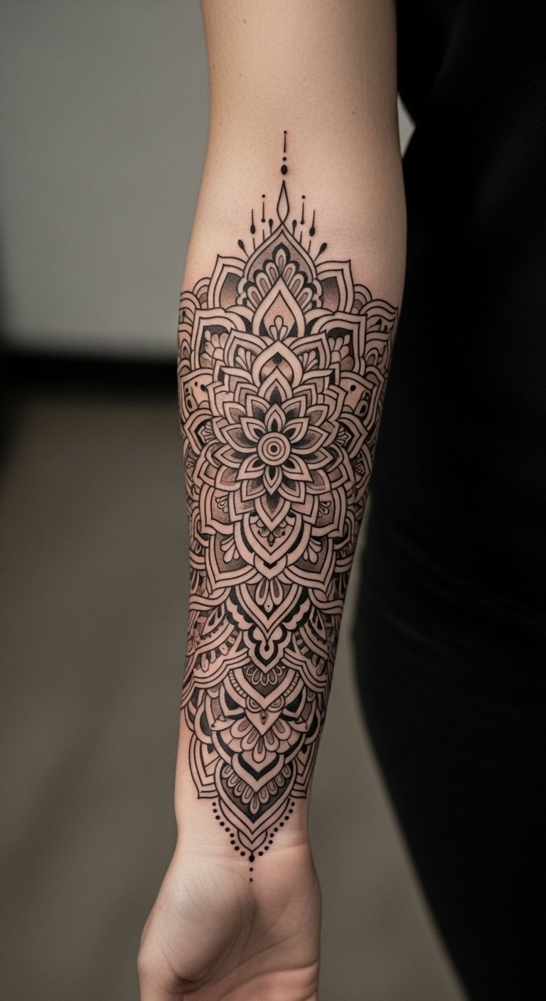 The mandala tattoo on the forearm serves as a constant reminder of inner peace and spiritual wholeness.