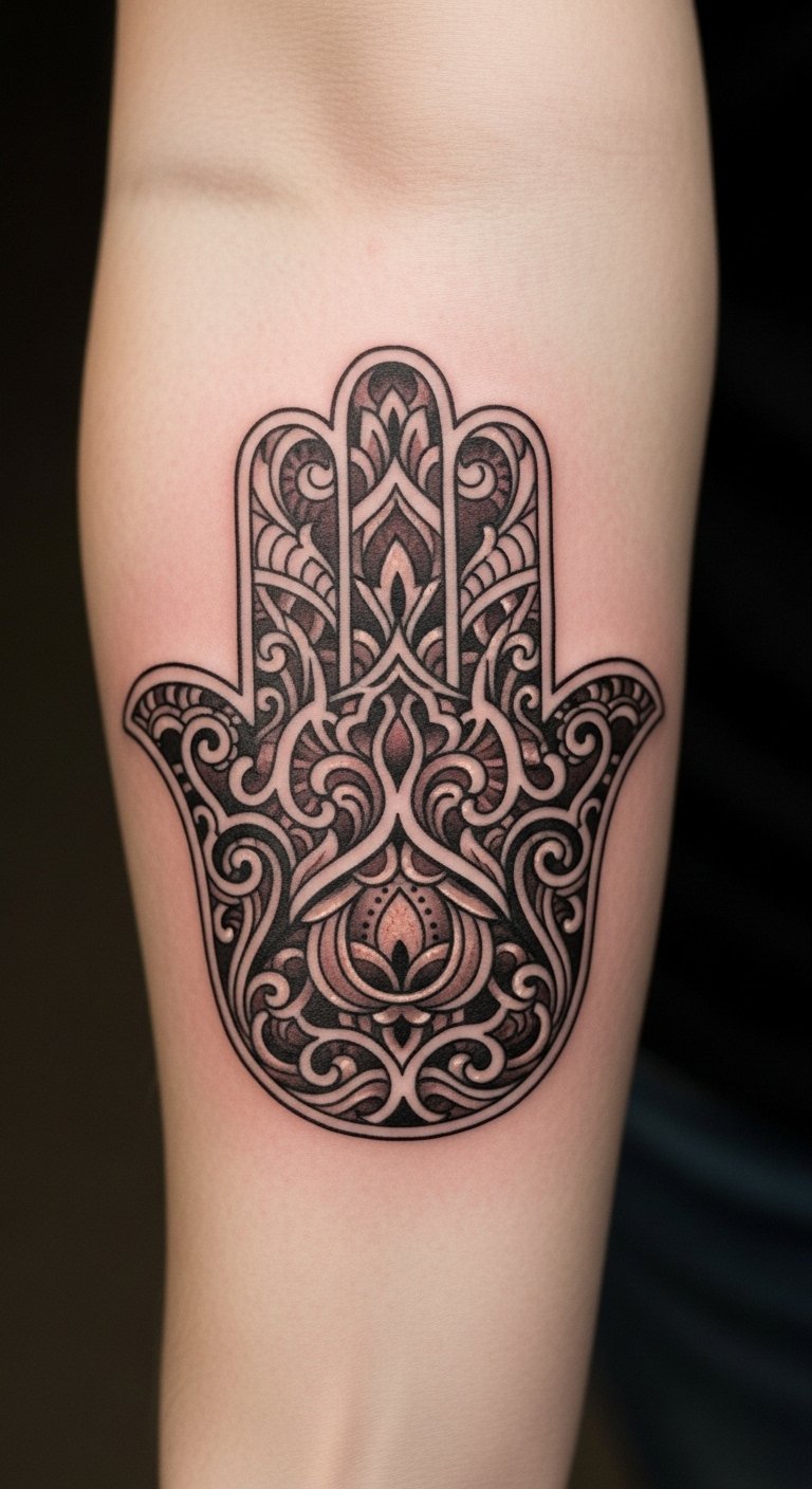 The Hamsa hand, deeply rooted in diverse cultures, serves as a powerful emblem of protection and blessings. Positioned on the forearm, this tattoo not only embodies ancient wisdom but also acts as a daily reminder of guidance and spiritual freedom.