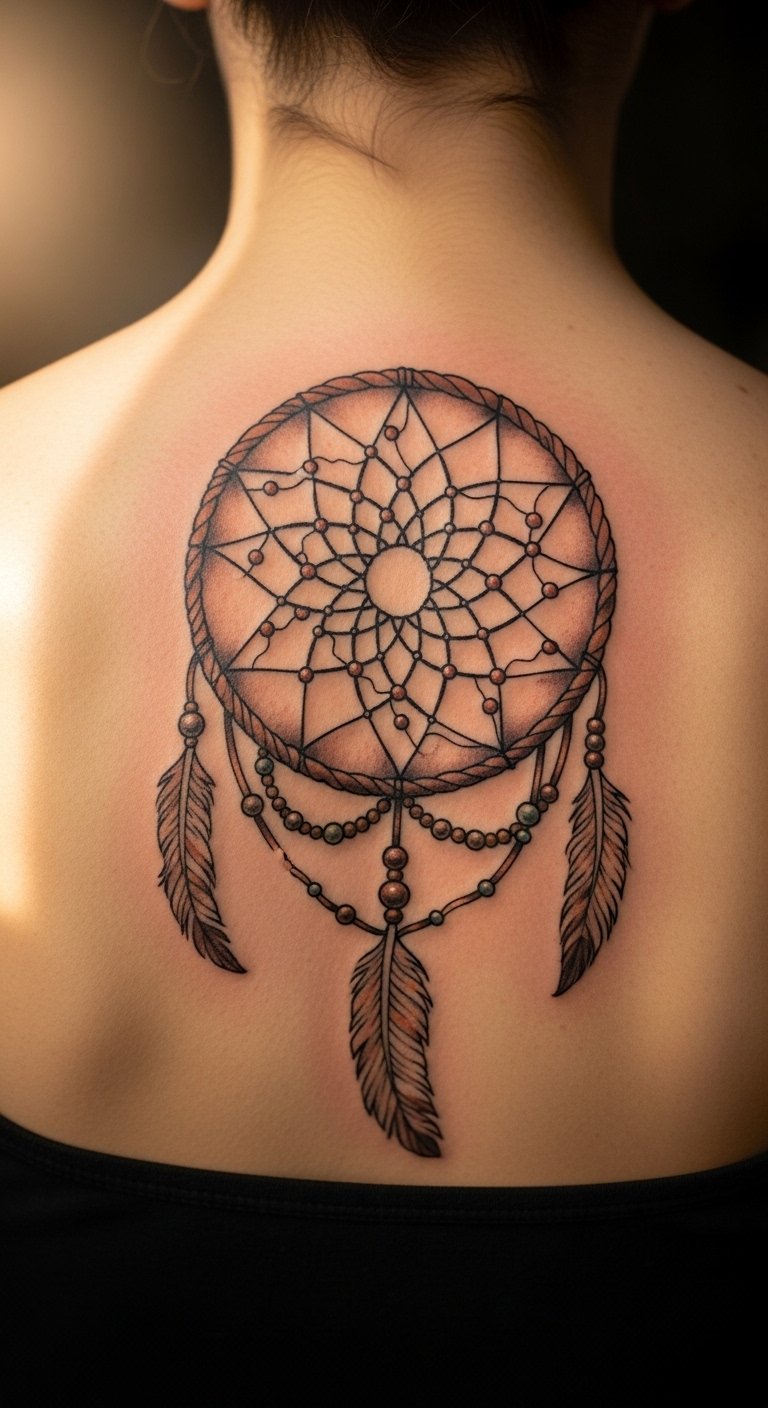 The dreamcatcher tattoo on the upper back symbolizes protection and spiritual guidance, serving as a personal talisman against negative energies.