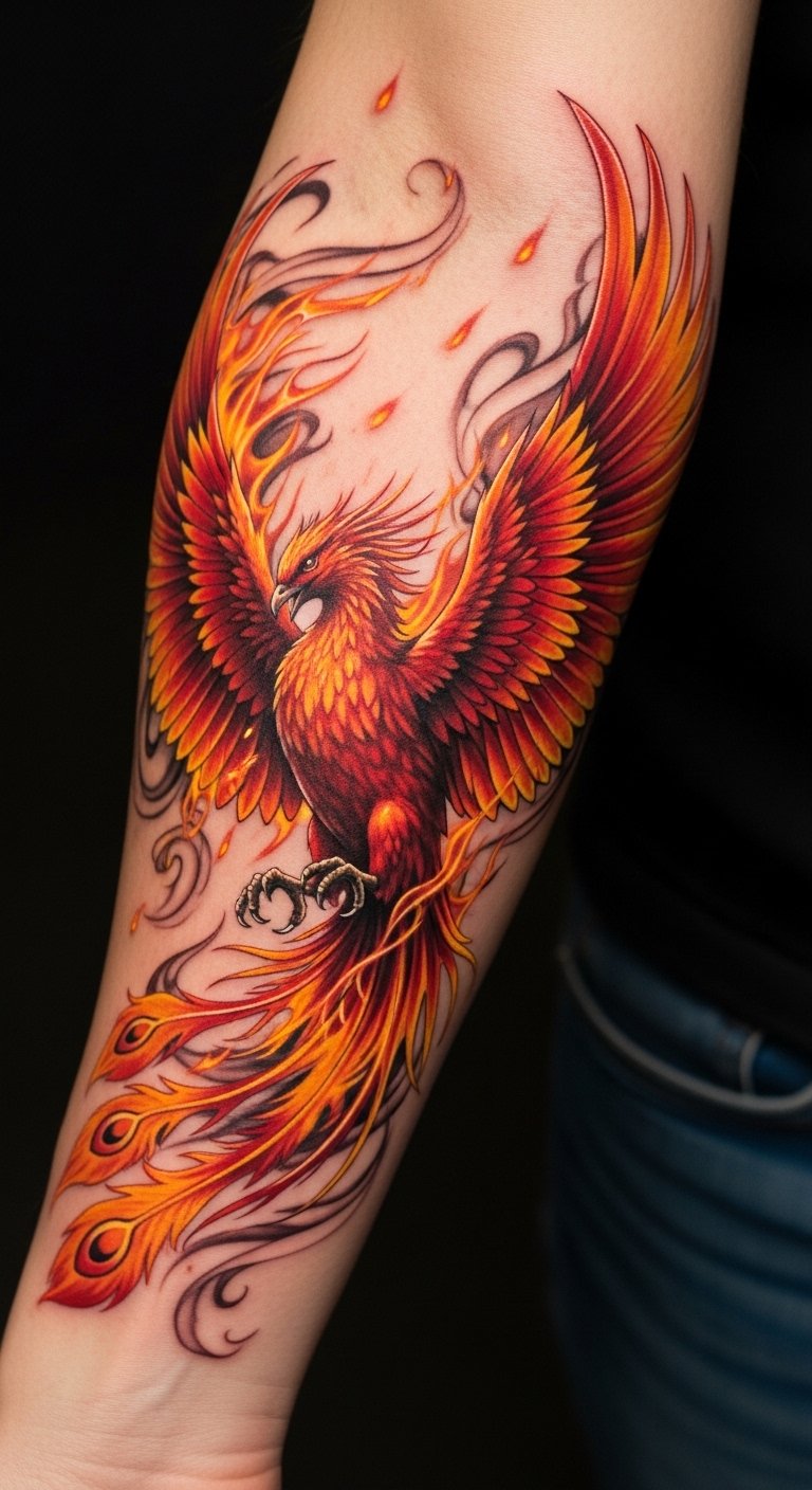 The tattoo of the phoenix is a powerful symbol of rebirth and resilience, perfectly placed on the forearm, making it easily visible and a daily reminder of personal strength.