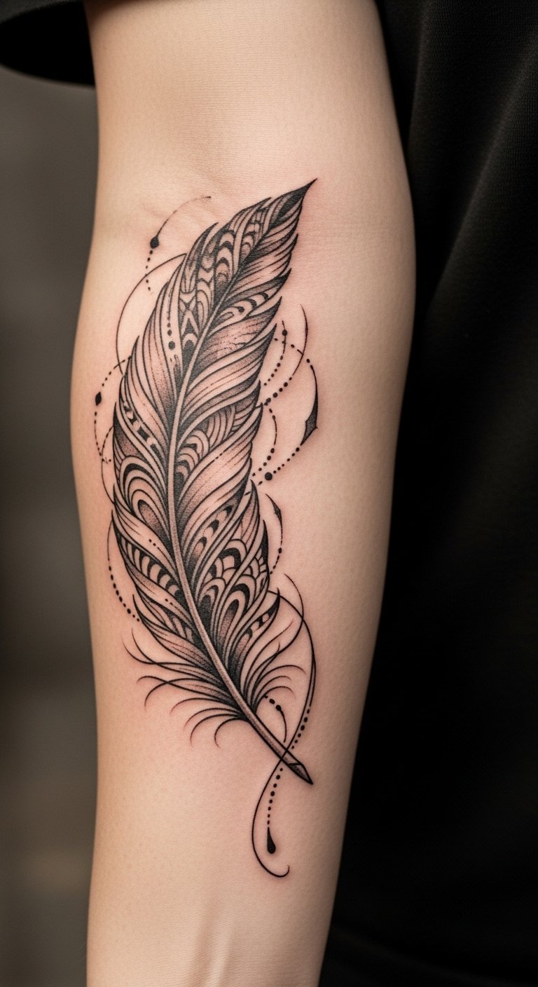 This feather tattoo represents a deep connection to freedom and spiritual communication, embodying the essence of flight and the healing power of nature.