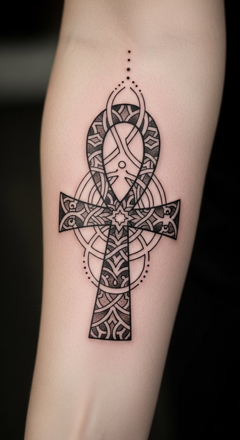 This ankh tattoo reflects the wearer’s journey and connection to the themes of eternal life and spiritual continuity. Positioned on the inner forearm, it serves as a constant reminder of immortality and the afterlife, inviting introspection and celebration of perpetual existence.