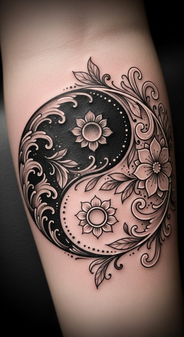 The tattoo serves as a guiding force, encouraging meditation and balance practices that celebrate the beauty found in contrasting elements.