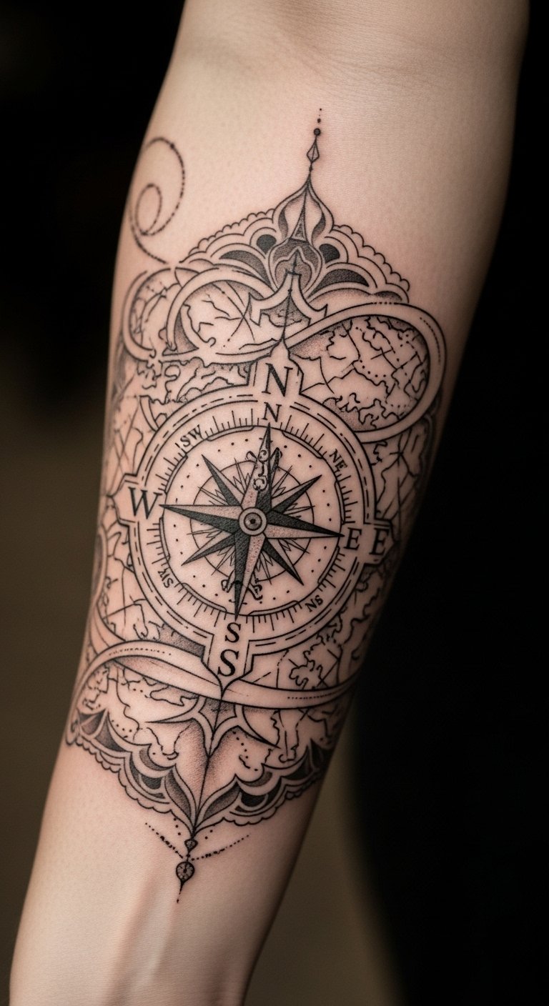 This compass tattoo on the forearm symbolizes the inner guidance that leads one through life’s complexities.