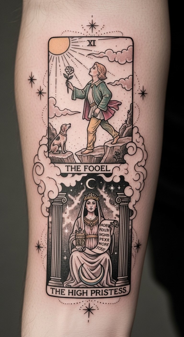 The tattoo embodies the essence of self-discovery and personal growth, symbolizing the journey of understanding oneself through the guidance of tarot.
