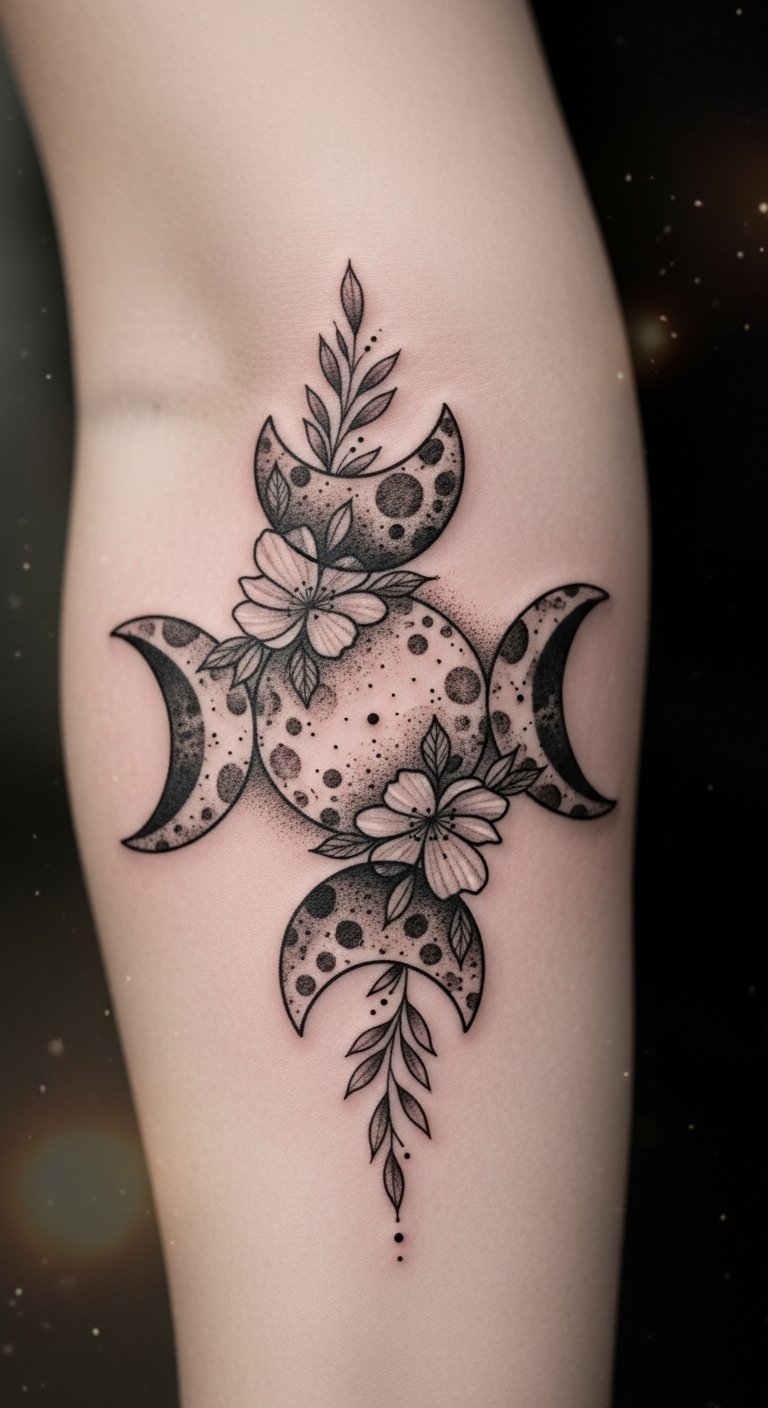 The Triple Moon tattoo symbolizes the sacred cycles of life and the divine feminine energy. Each moon phase represents different aspects of femininity: the waxing moon embodies growth and intuition, the full moon signifies empowerment and culmination, while the waning moon reflects transformation and release.