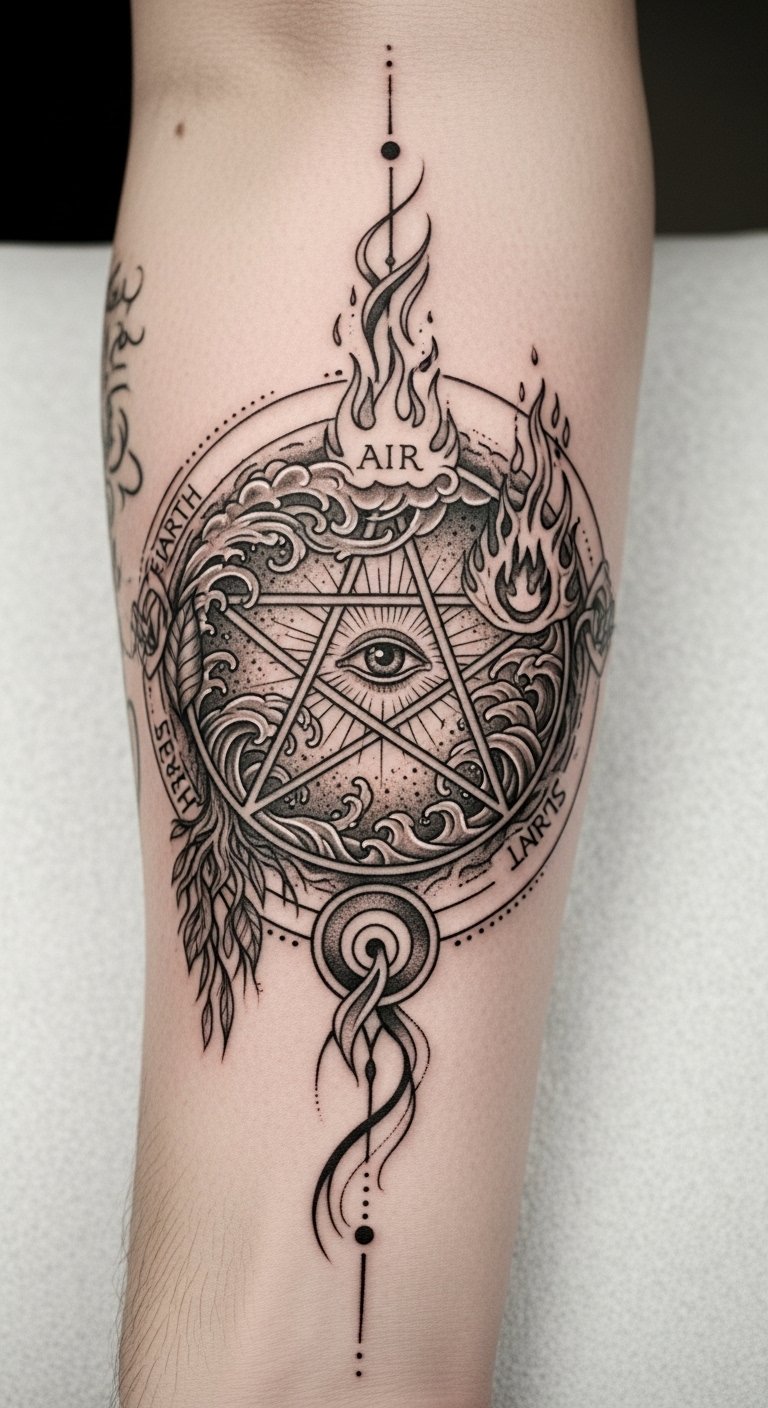 This tattoo embodies the essence of the pentacle as a talisman of spiritual balance, inviting the wearer to connect with the elements and their own inner harmony.
