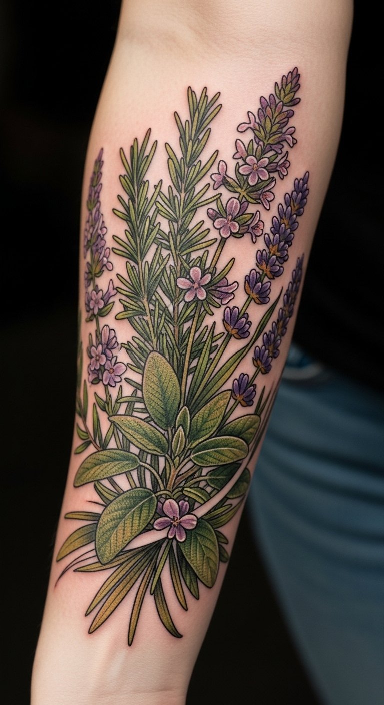 This tattoo design resonates deeply with the meanings of the herbs depicted, where rosemary signifies remembrance, sage embodies wisdom, and lavender offers tranquility.