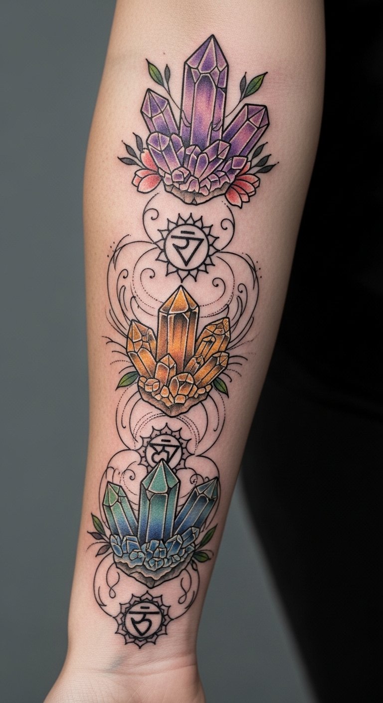 Positioned on the forearm, it serves as a constant reminder of cosmic awareness and vibrational healing, inviting a deeper connection to one’s spiritual journey.