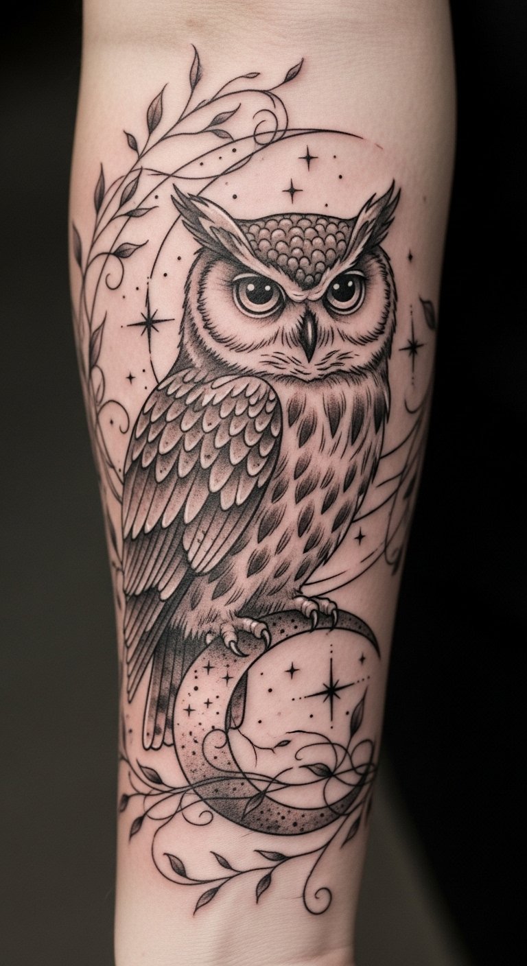 This tattoo embodies the essence of animal familiars, with the owl symbolizing deep intuition and ancient wisdom, guiding the wearer on their soul’s journey.
