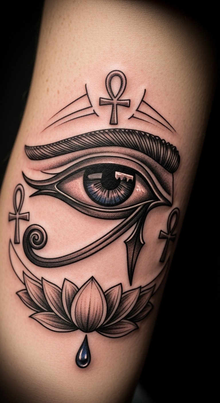 The Eye of Horus tattoo, placed on the forearm, serves as a constant reminder of protection and personal strength.