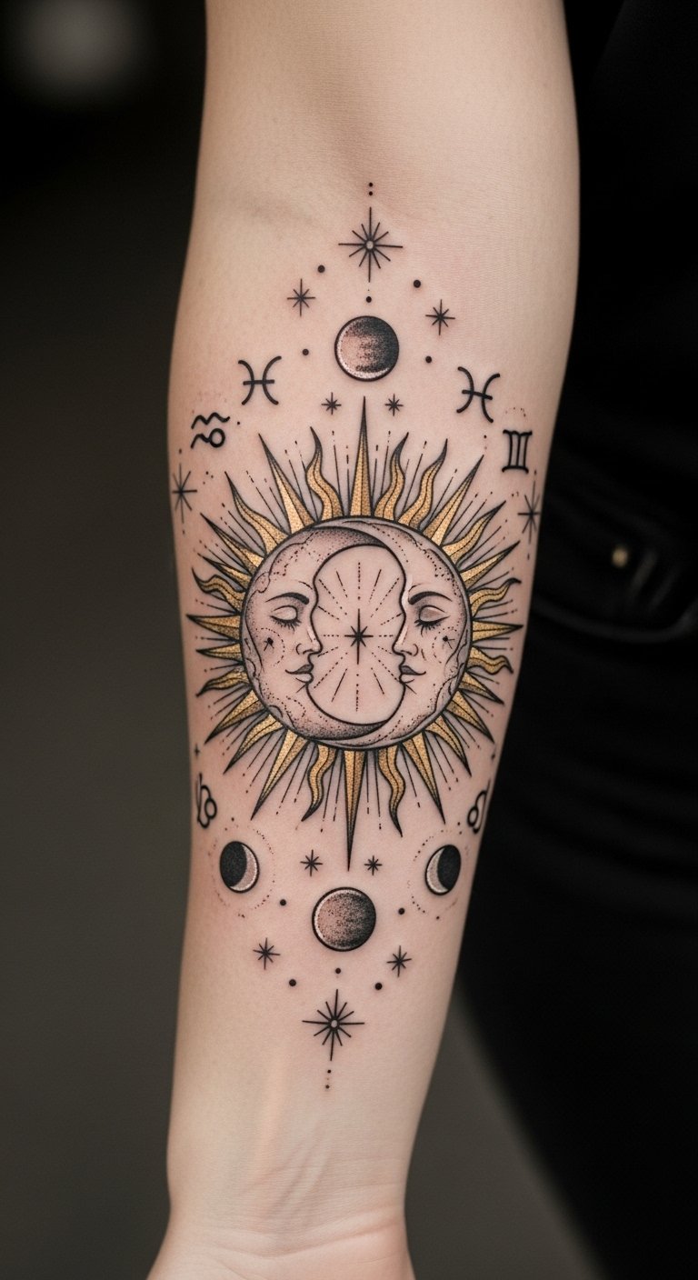 Positioned on the forearm, it serves as a constant reminder of cosmic harmony and astrological influences guiding one’s path. The visible placement allows for personal reflection and connection with the universe, embodying the essential balance that elevates the soul.