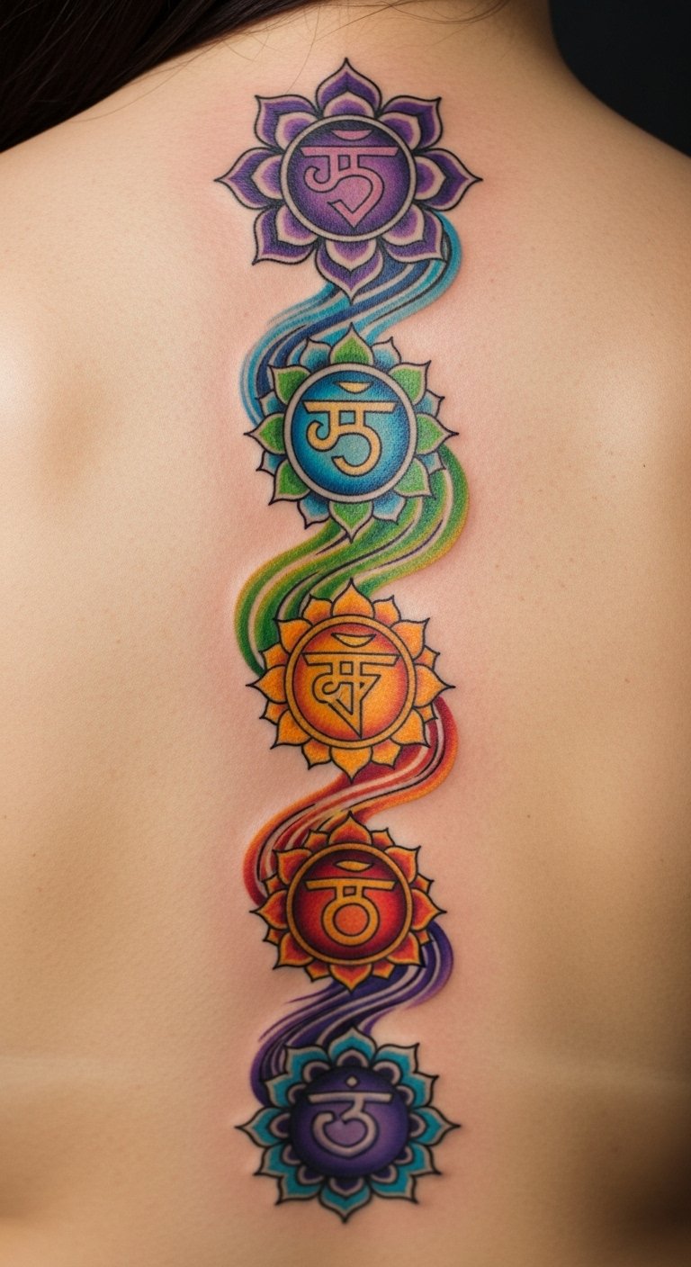 A tattoo along the spine symbolizes the journey of self-discovery and spiritual awakening through chakra alignment.